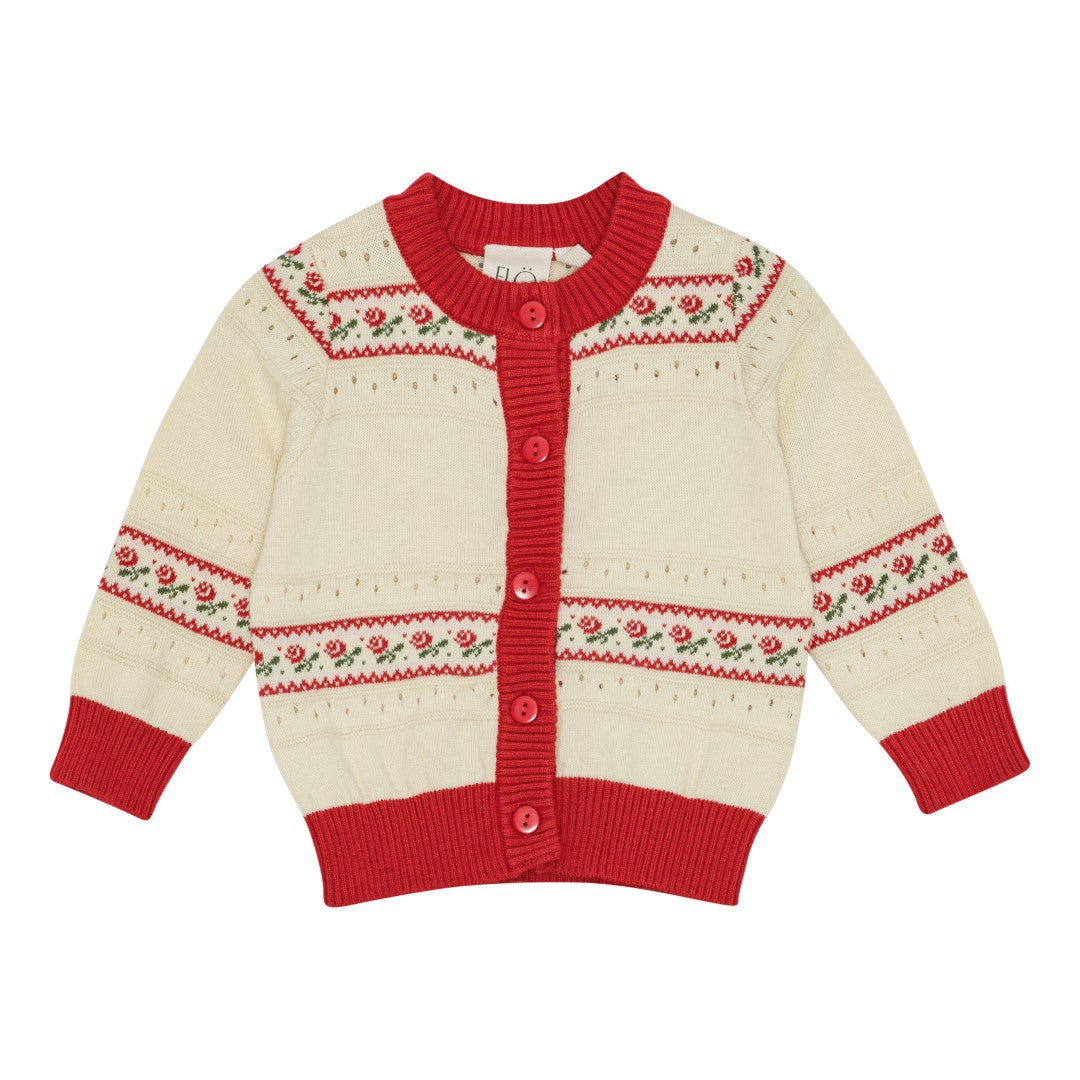 The Lucca Cardigan is made from cotton pointelle knit with a lovely rose pattern. Featuring regular sleeves, a round neck, contrasting rib at edges and front closure with red buttons.