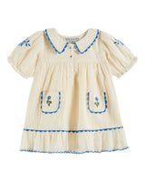 A standout style from Emile et Ida this season! We adore this beautiful ecru dress with its blue embroidery (especially the flowers on the front pockets) and scalloped details. 100% cotton, made in India.