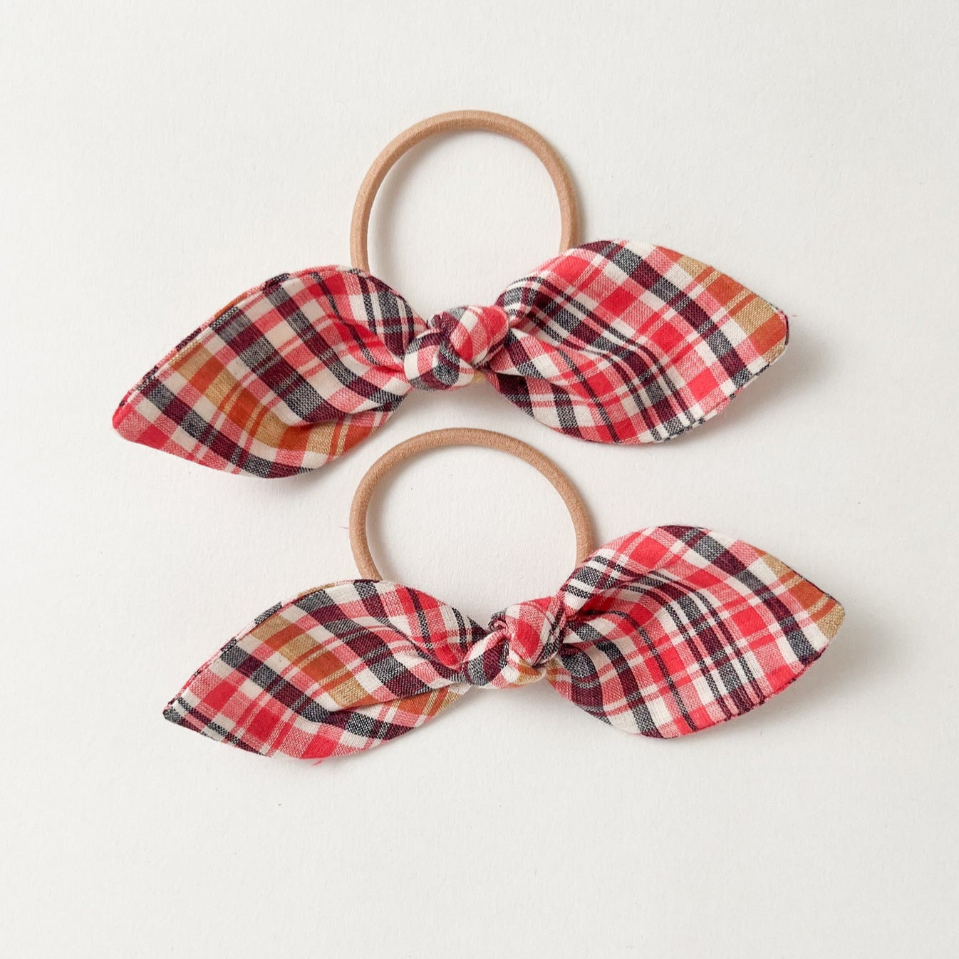 Sets of two Hair Ties in a pink, red and dark blue check, hand-sewn onto strong simple nude elastic. They are great for ponytails, pigtails, bunches, and buns.
