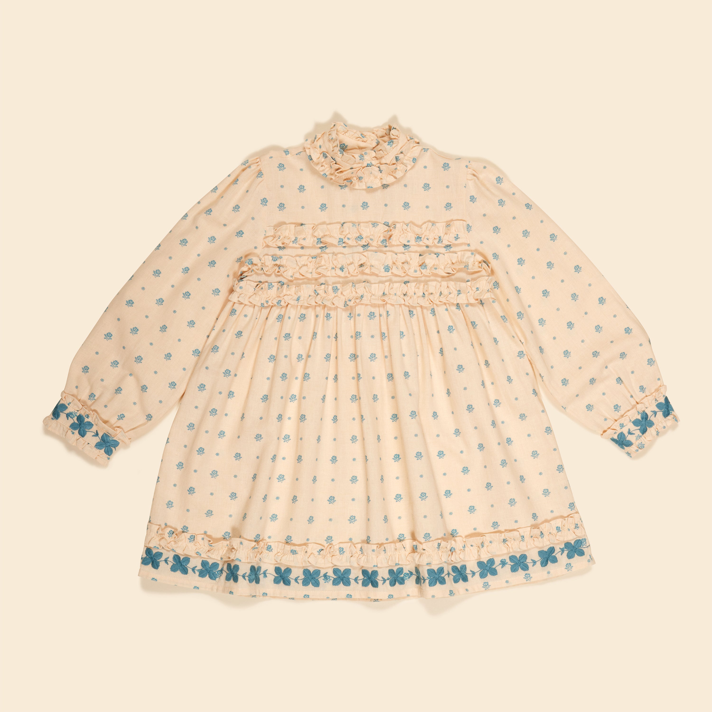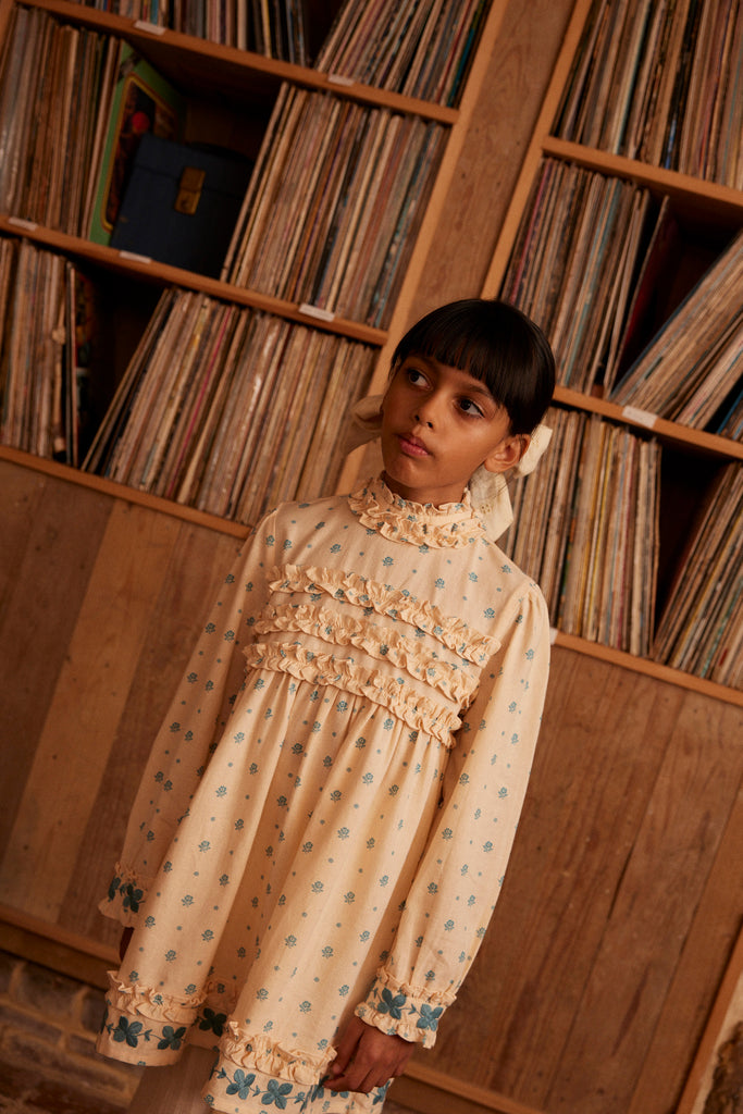 Pernille is the prettiest new dress in the season’s ‘meadow calico’ rustic cotton-linen. With sweet ruffles trimming the neckline, chest, cuffs and hem, we love Pernille’s 1960s mood for parties and special occasions. Featuring sweet floral embroideries at cuffs and hemline. Button through closure at back. We love her worn with boat shoes for an effortlessly elevated look.