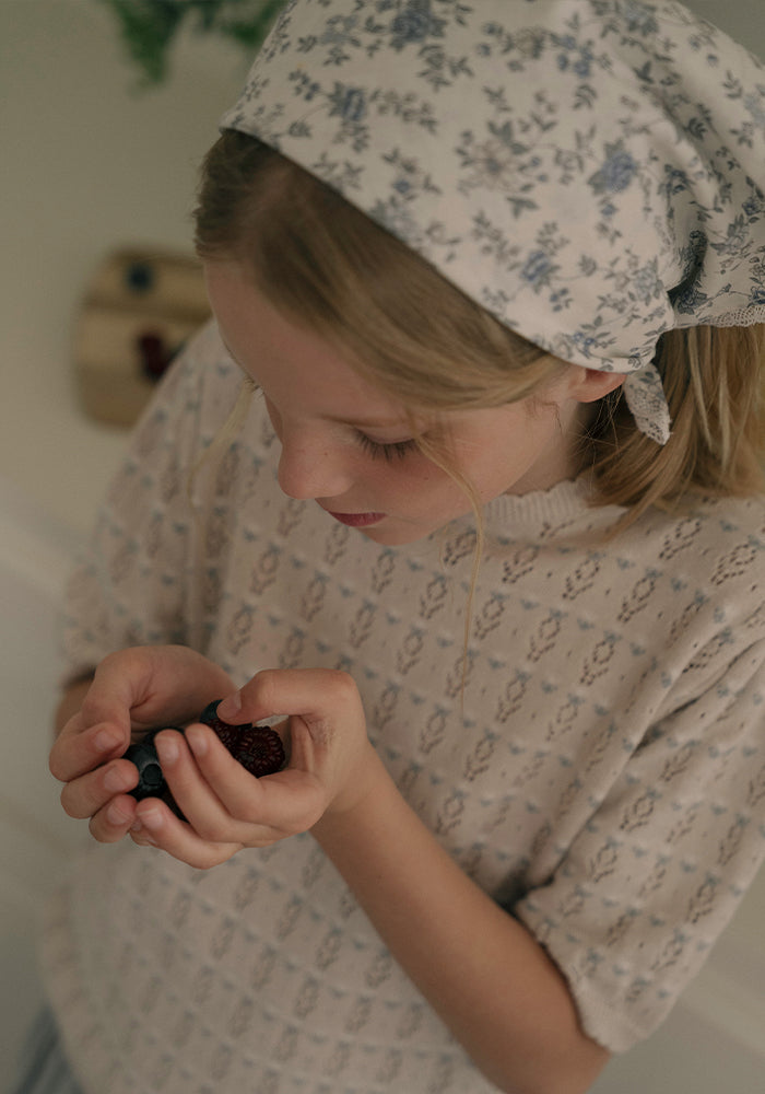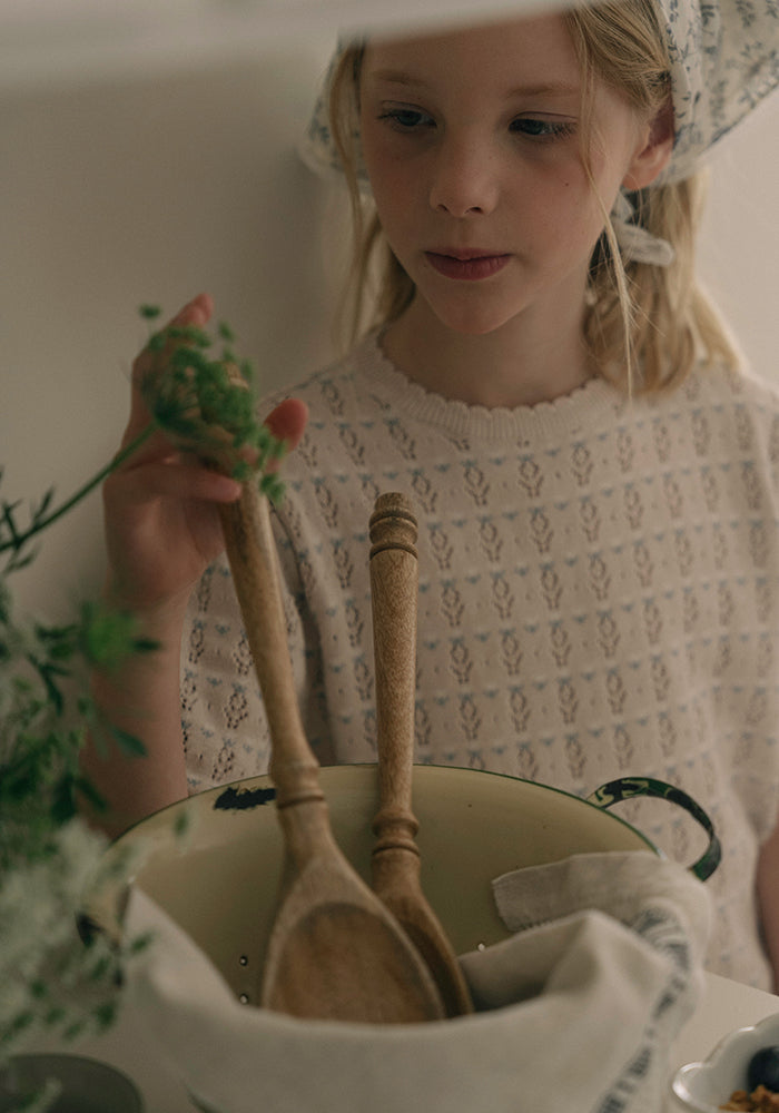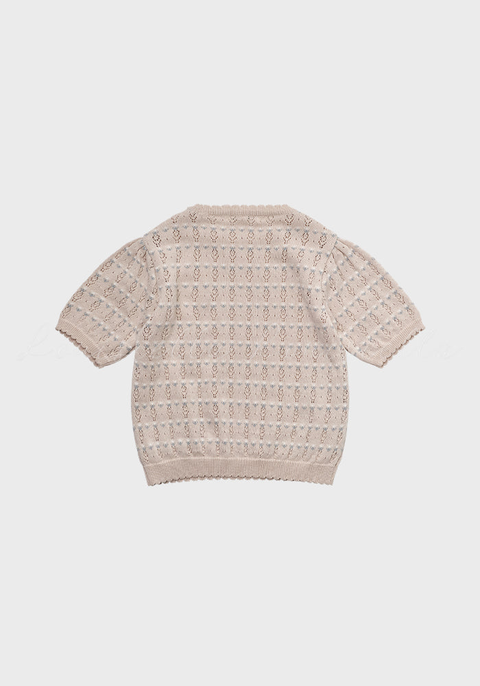 Louisiella’s short-sleeved knit pullover is crafted from soft-touch yarn and features delicate openwork stitching with sweet floral motifs throughout. Scalloped edges at the neckline and sleeves add a lovely, playful finish, perfect for breezy spring days. 100% cotton, made in Korea.