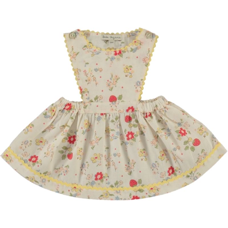 The lovely Annice baby apron dress is crafted from 100% cotton in the most charming strawberry motif. The beautiful yellow lace along the hem and sleeves adds retro charm. Designed with comfort in mind, it offers a relaxed fit perfect for play or special days out. Layer with the yellow summer knit cardigan for the cutest little look.