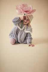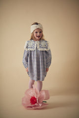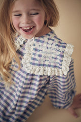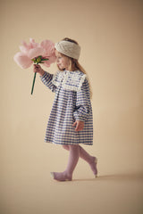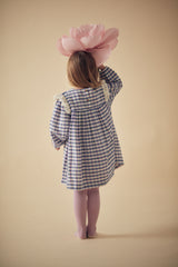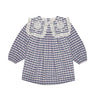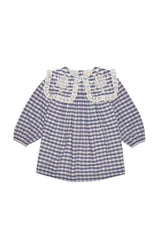 A soft flannel dress in a blue and purple check with a large, vintage-style collar. Puff sleeve and elasticized cuffs. Button placket at the back. Please note: the back is buttoned from top to bottom for sizes under 24 months. Fits true to size.