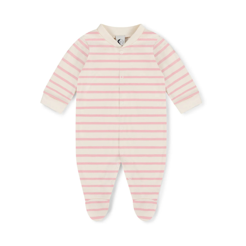 The sweetest baby sleepsuit in Sleepy Doe's pink breton stripe - perfect for bedtime but cute enough for day wear. Snaps run down the front and inner leg for easy changing.