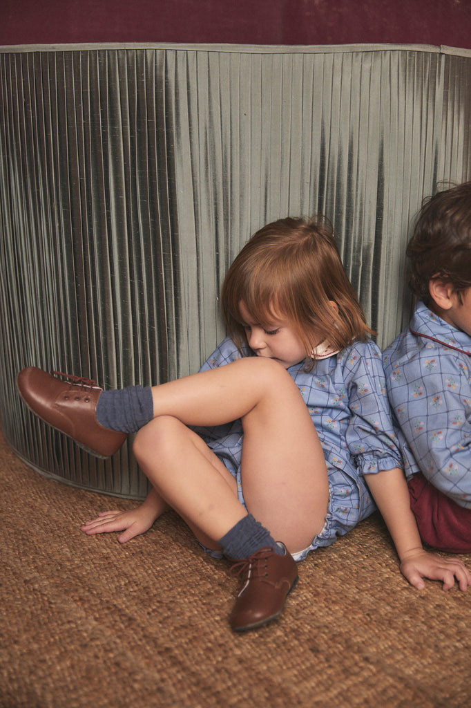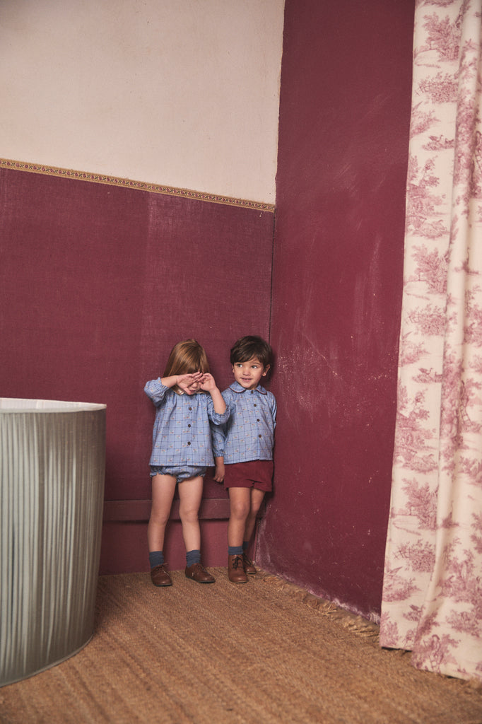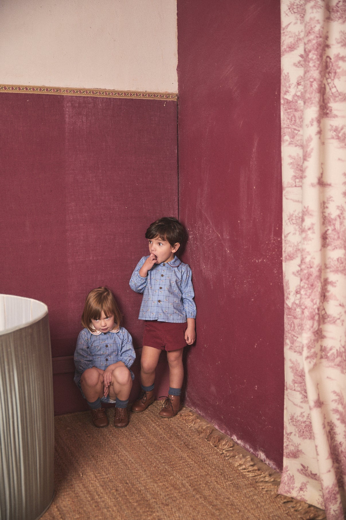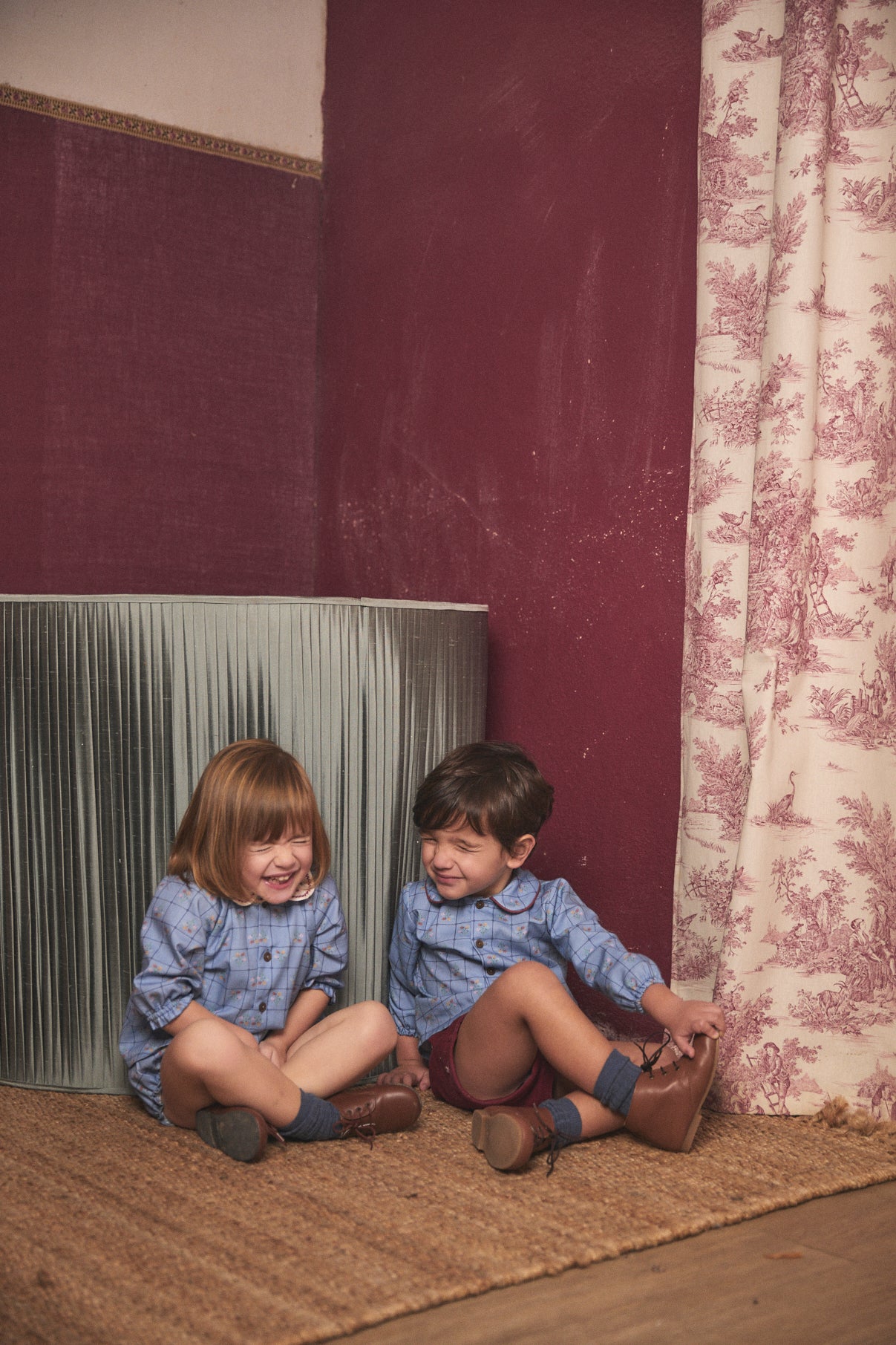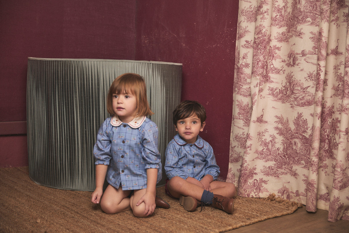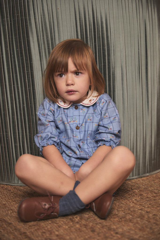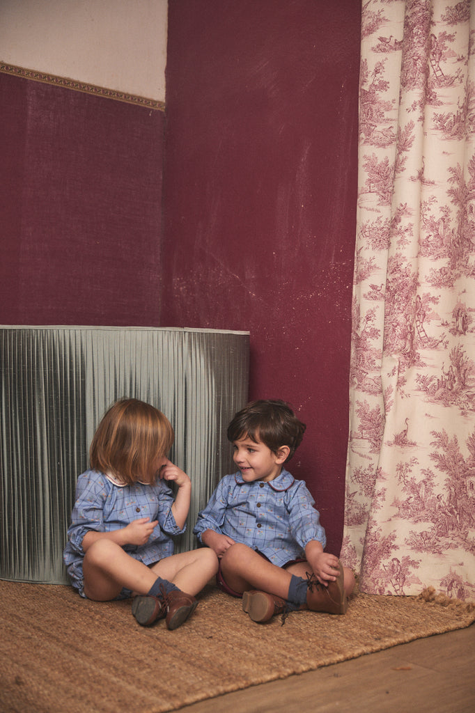Coming soon! The most charming gingham baby set, featuring a statement embroidered Peter Pan collar, classic wood buttons, and gently puffed sleeves. Fully lined.