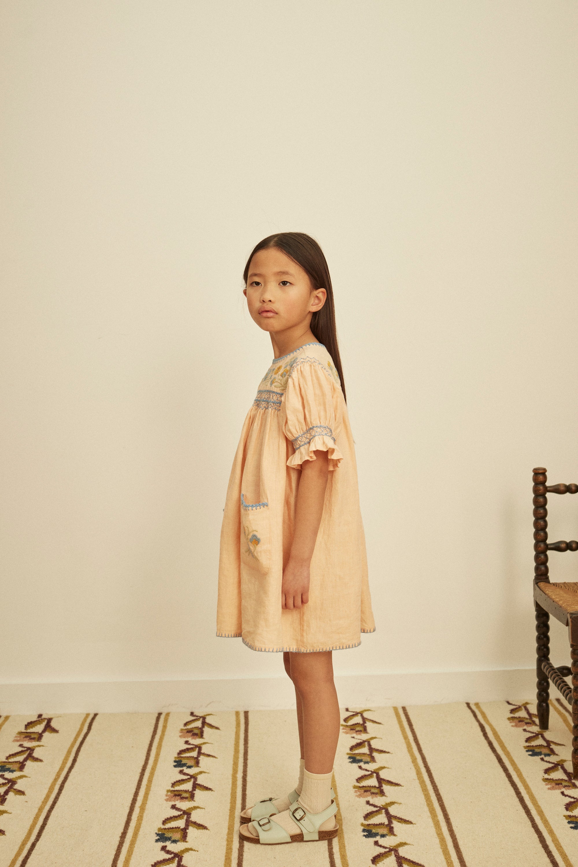 The delightful Dora dress comes in Apolina's ‘satin pink’ linen. With classic yoke embroidery in the season’s pastel tones, contrast hand smocking at chest and puff sleeves, contrast crochet at neckline and pockets, and blanket stitch finish at hem. Invisible zip at closure at back. We love Dora worn with sandals for parties or summer days out.