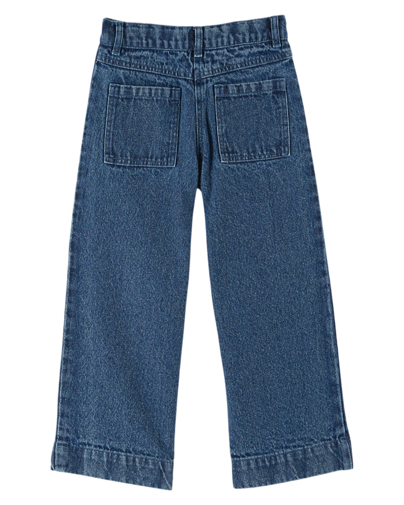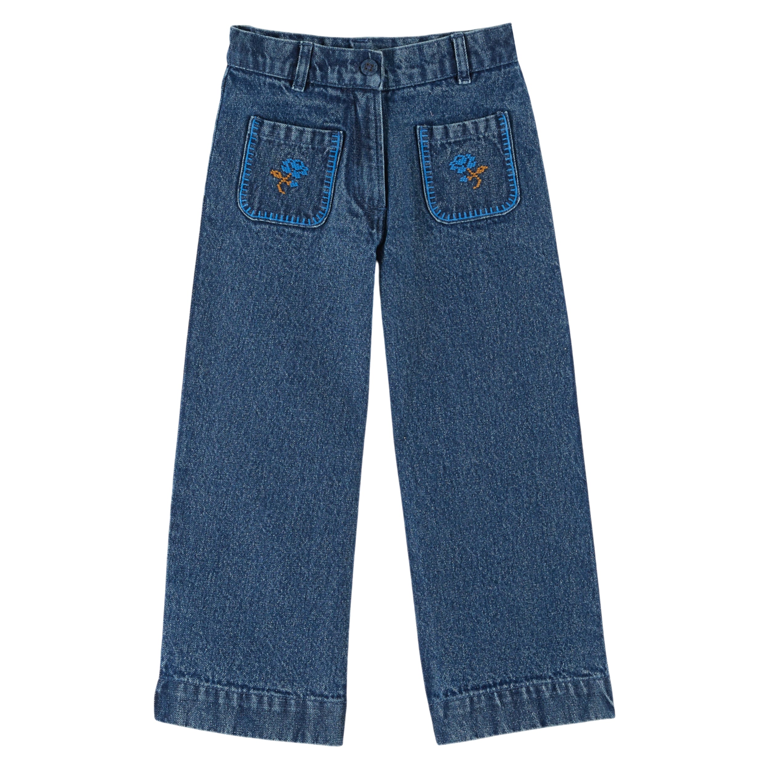 The cutest denim pants featuring embroidered patch pockets. Featuring a zipper and button closure, but with an interior adjustable waist band to create the perfect fit. We love thr blue contrast embroidery. 100% cotton, made in India.