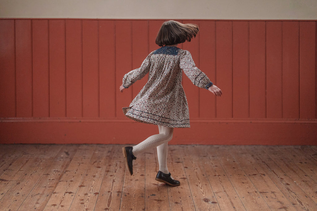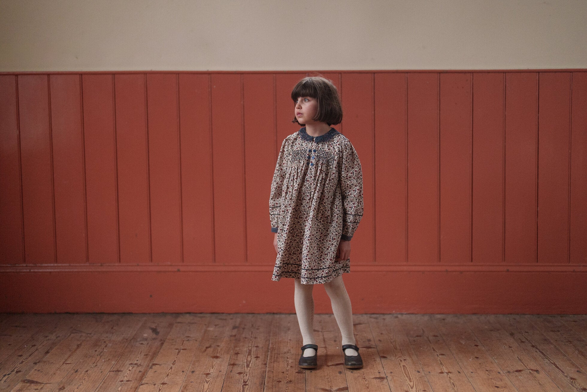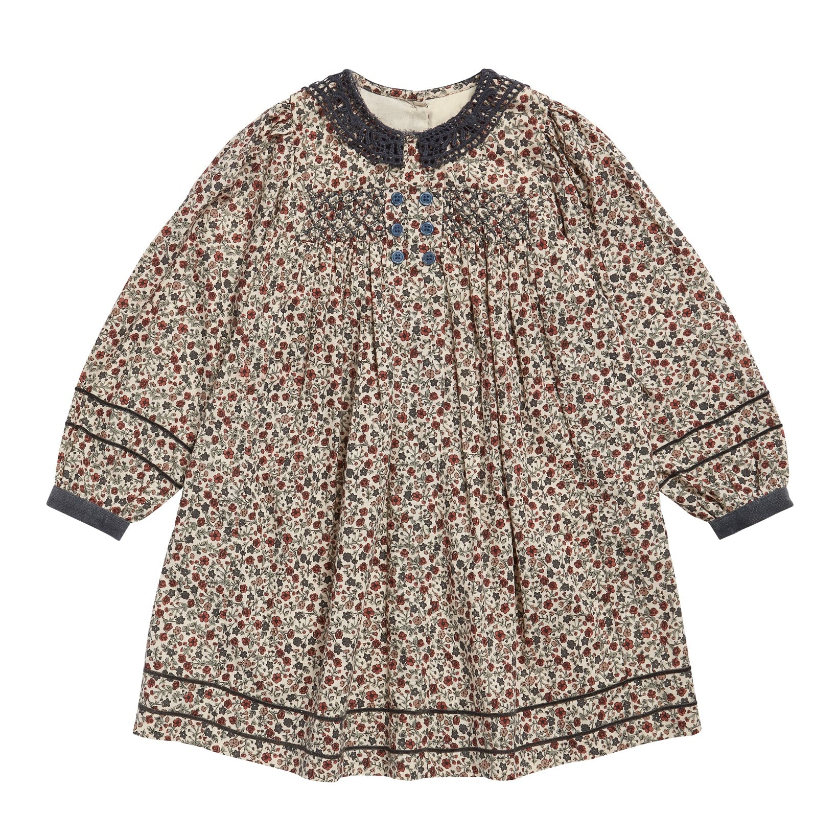 This beautiful vintage-inspired dress is made in Little Cotton's organic cottage print floral fabric. It has long, full sleeves finished with neat little velvet cuffs, a cotton lace sailor collar and two rows of velvet ribbon to the sleeves and hem. The front button placket has a double row of buttons, on either side of which are hand-smocked panels.