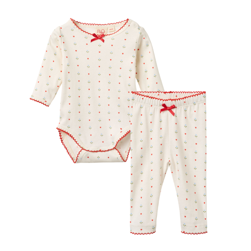 The Fresa onesie is made from a soft jersey cotton with a cute print and decorative lace edges. It features snap buttons at shoulder and between the legs for easy dressing. The matccing leggings have a slim-fit and elastic waistband.