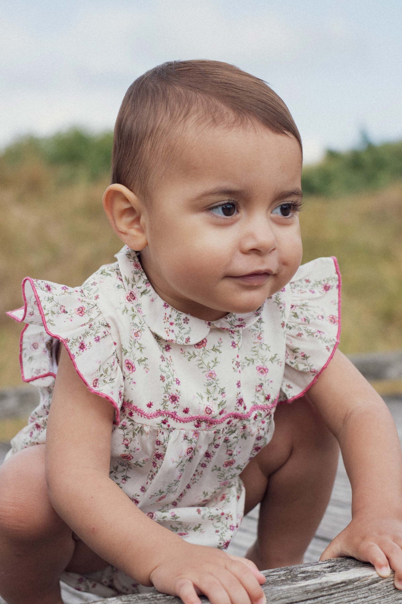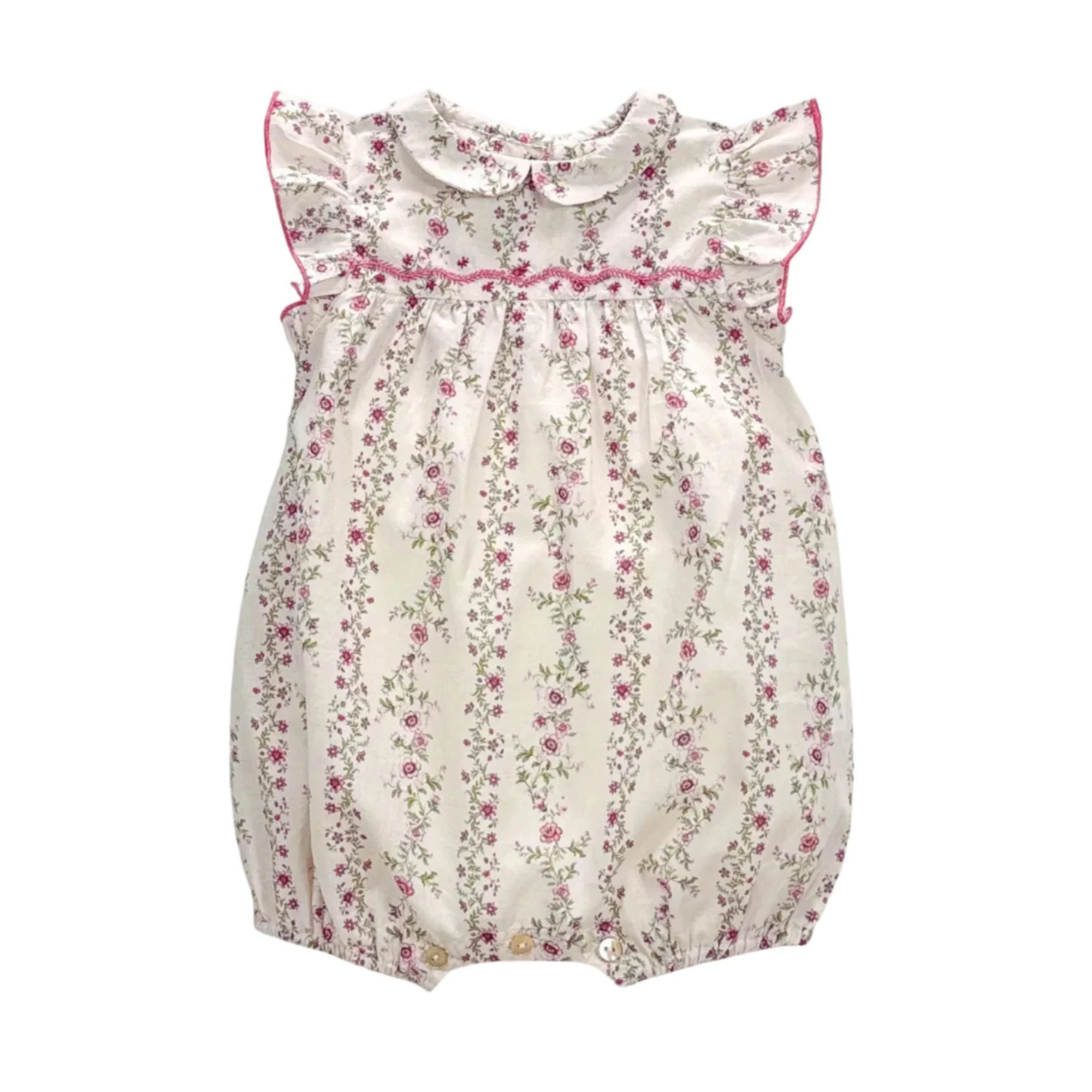 The Gilda romper is a timeless style with beautiful hand embroidery at the bodice. We love the airy cotton fabrication with its 'roses farandole' print. Butterfly sleeves with a contrasting bourdon stitch finish. Comfortable loose elastic at thighs, and a bubbly, oversized fit. Buttons at back and between the legs for easy changes.