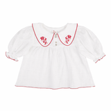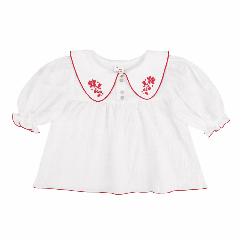 Girls’ blouse with soft balloon sleeves adorned with delicate piping at the hem. Features a Peter Pan collar that's been embroidered and front placket with mother of pearl buttons. A graceful piece that pairs perfectly with the Deolinda shorts.