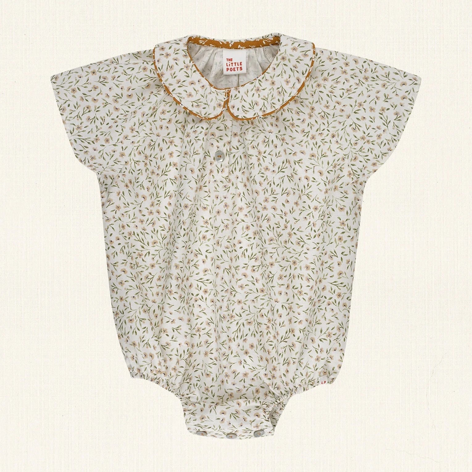Floral short-sleeved romper with a front opening and mother-of-pearl buttons. Finished with a Peter Pan collar outlined in contrasting piping. A tender piece that captures the charm of summer days and the gentle poetry of childhood. THE LiTTLE POETS celebrates high-quality pieces inspired by delicate, poetic details and the beauty of children’s self-expression.