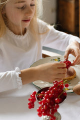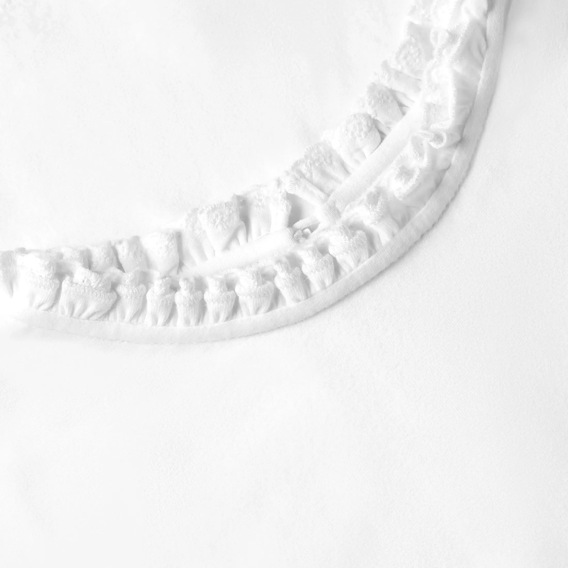 Short-sleeved top made from delicate cotton pointelle with a naturally airy texture. The handcrafted ruffle collar gives a soft French note, while White ajour enhances its graceful purity.