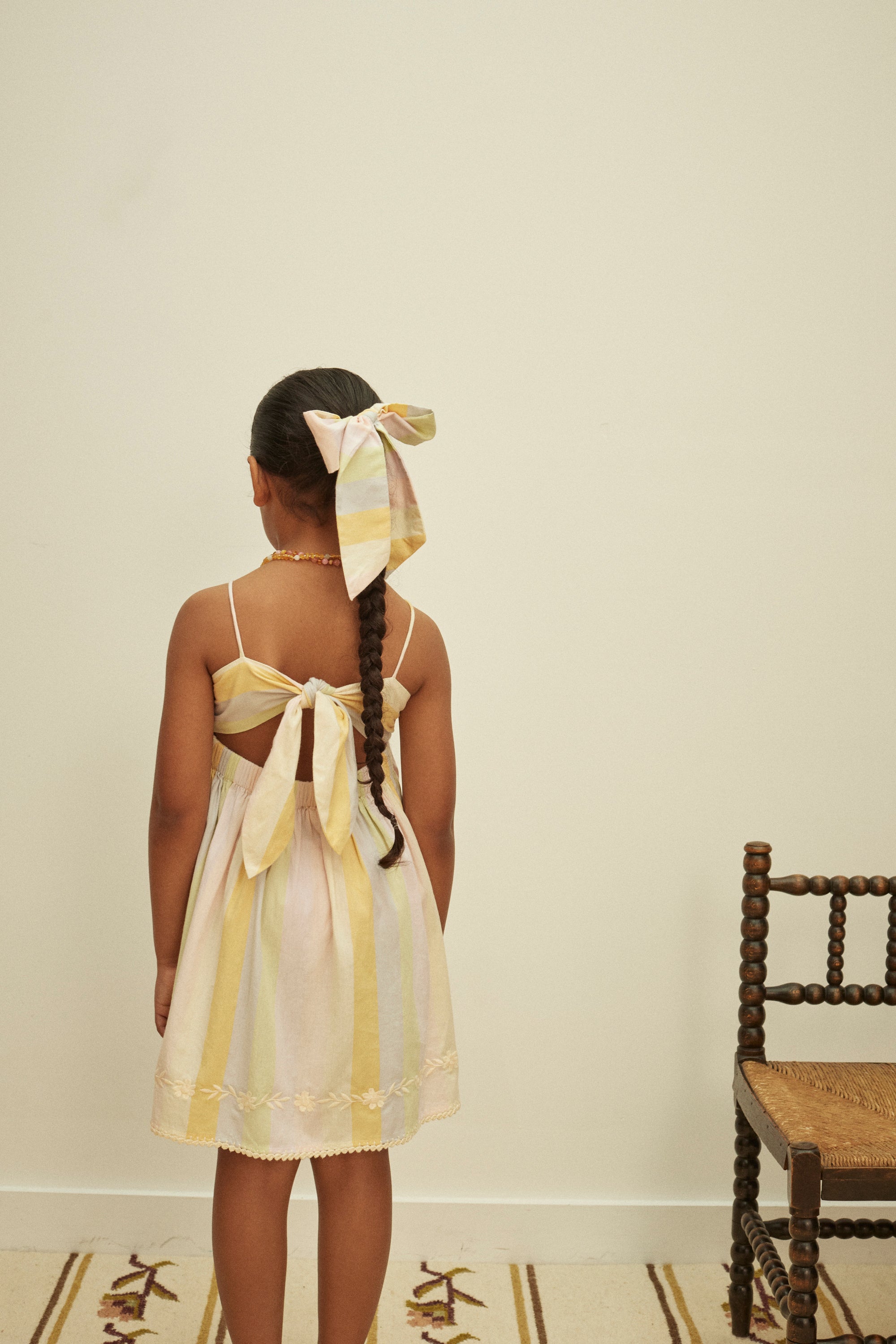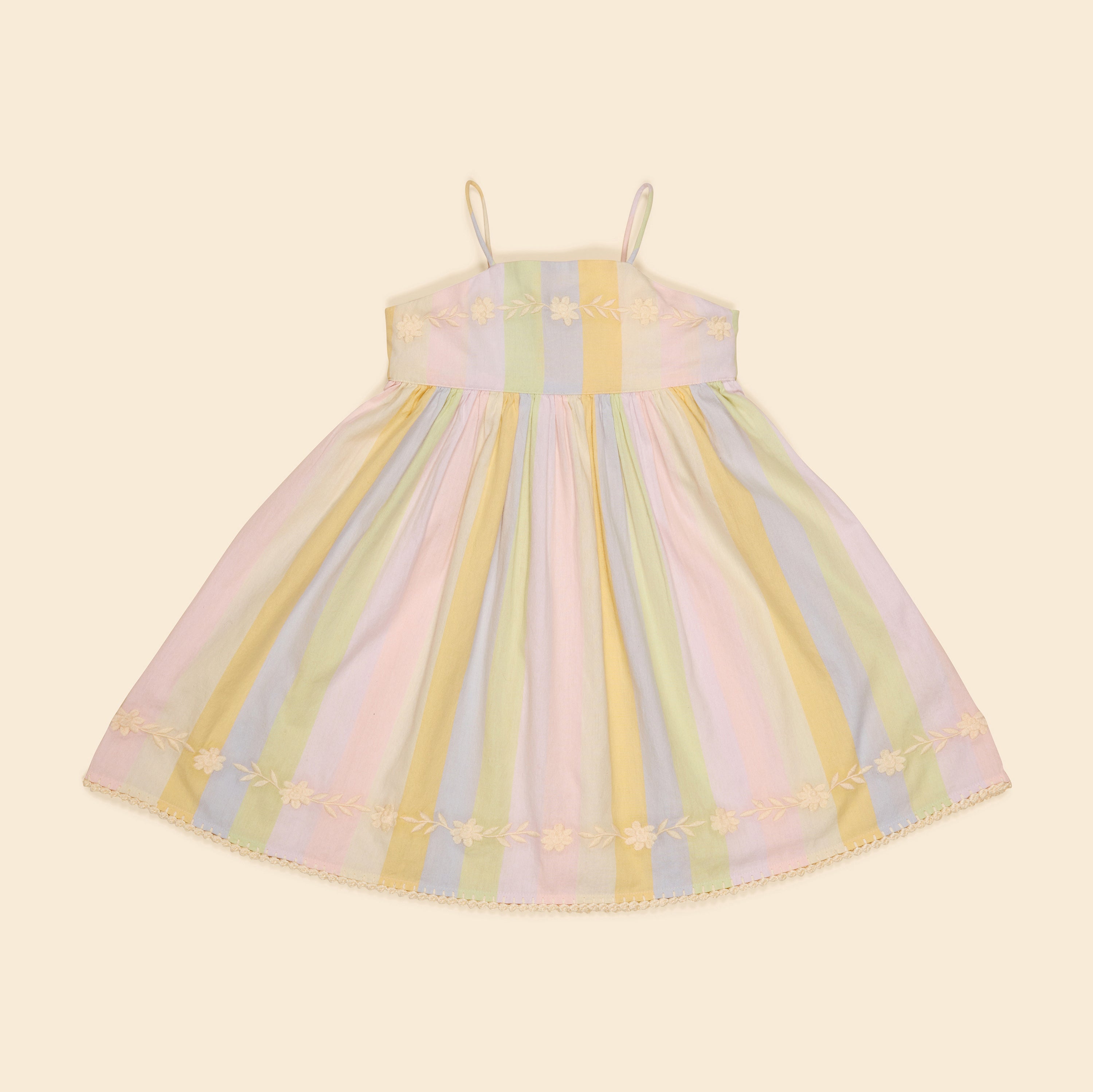 Apolina's classic Magrit sundress style is updated in the season’s pastel rainbow ‘painters stripe’ cotton, for a sweet summer holiday mood. Featuring contrast floral embroidery at chest and hem, a statement tie back, shoestring straps, elasticated back waist and crochet detail at hem. We love Magrit worn simply with sandals for holidays, or accessorised for parties.