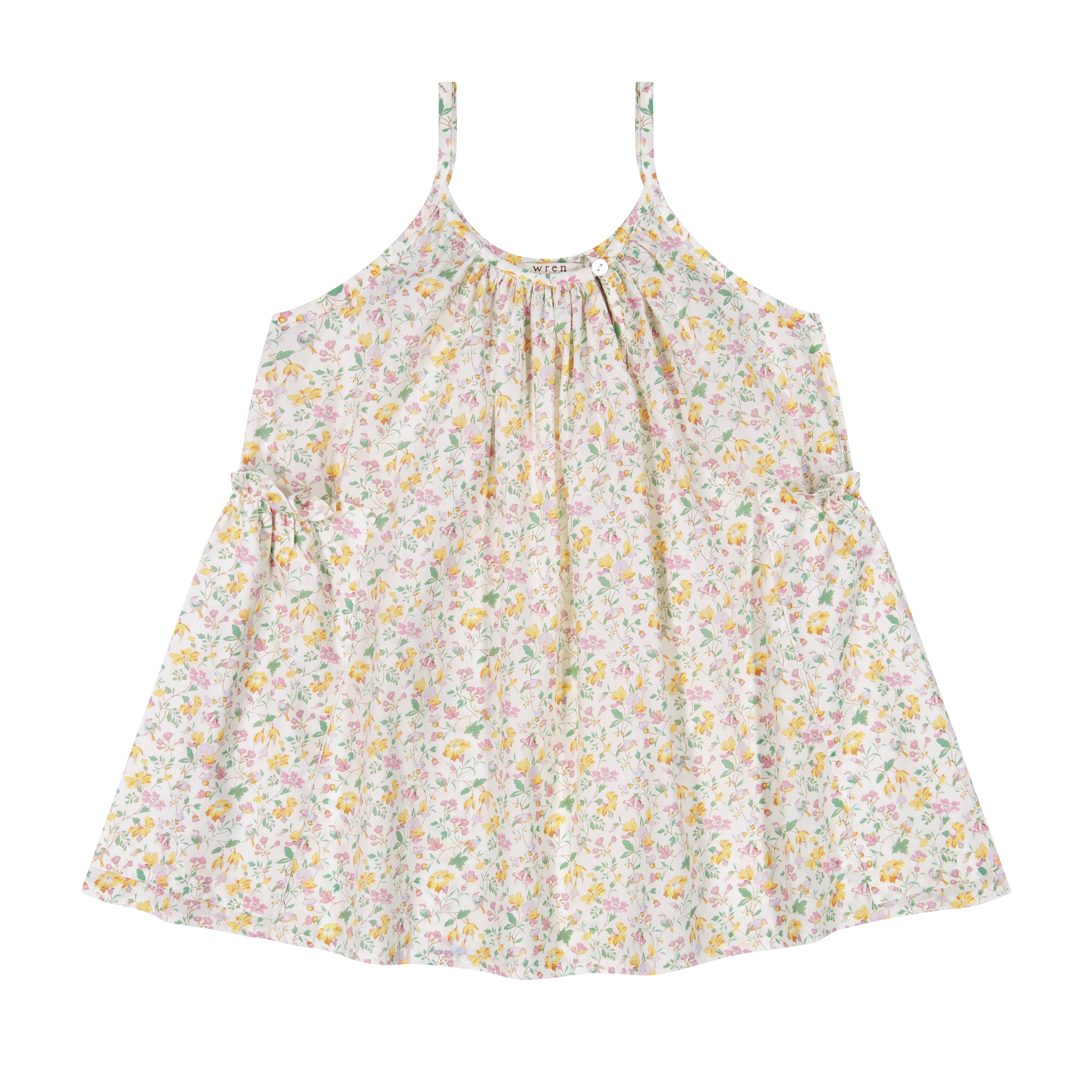 The Maude gathered pocket dress has two spacious frilled pockets on either side for collecting treasures. The front fastens with a simple V and button closure. A perfect layering style with slim, bias straps that also works beautifully alone. Handmade to order for Willkie’s.