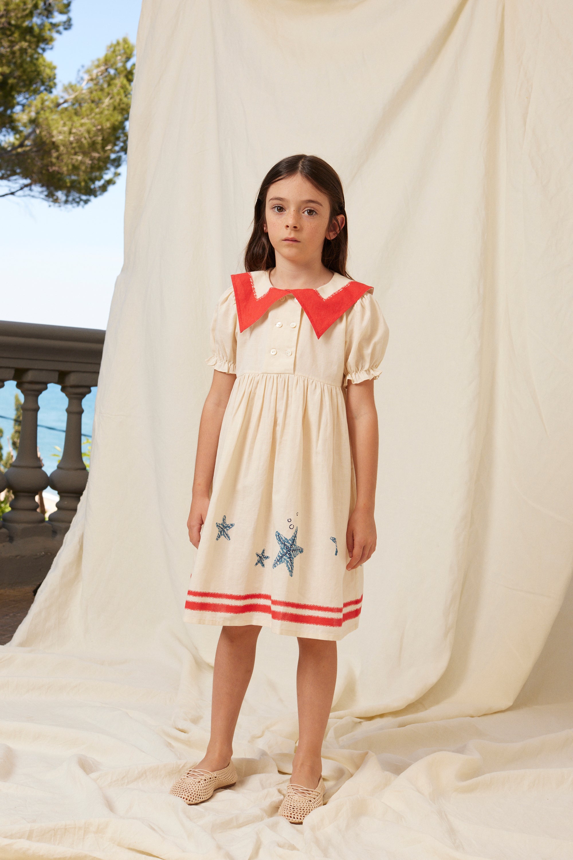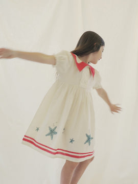 Adorable sailor-style Pearl dress in signature vintage-style cotton and linen blend fabric. Dress features a classical pointed collar, puff sleeves with elasticated gathering, and a roomy skirt perfect for twirling.