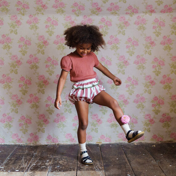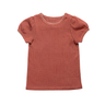 A lovely, simple and comfortable everyday t-shirt. Made from soft, organic, pointelle jersey fabric. Perfect with any of our bloomers, trousers or skirts. Smaller sizes have a press-stud neck opening.