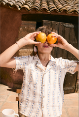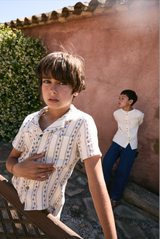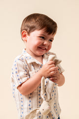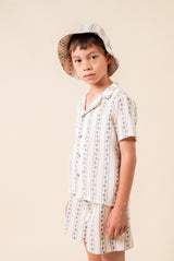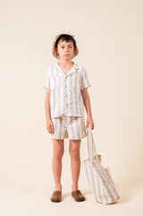 We couldn't resist this lovely boys outfit. The shirt feature lapels and wooden button, with two patch pockets. Pair it with the matching shorts for a sophisticated summer look. 100% organic cotton.