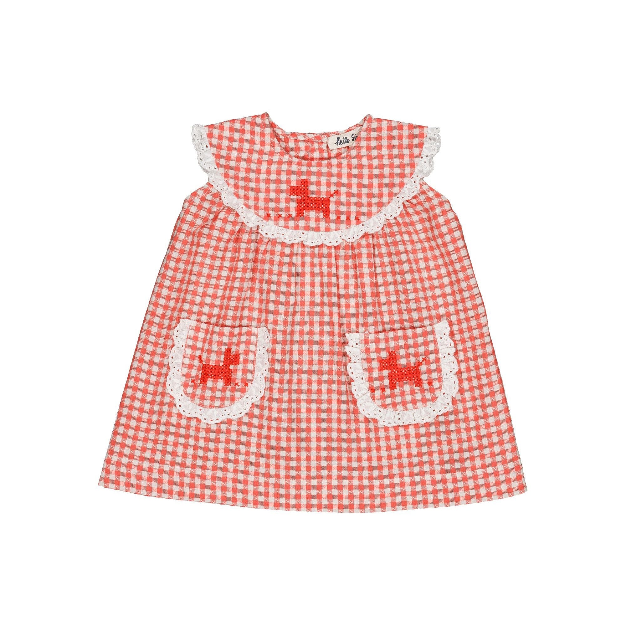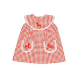An adorable sleeveless baby dress in gingham. English embroidery around rounded yoke. Puppy embroidered in yoke and patched pockets. Tab button on back.